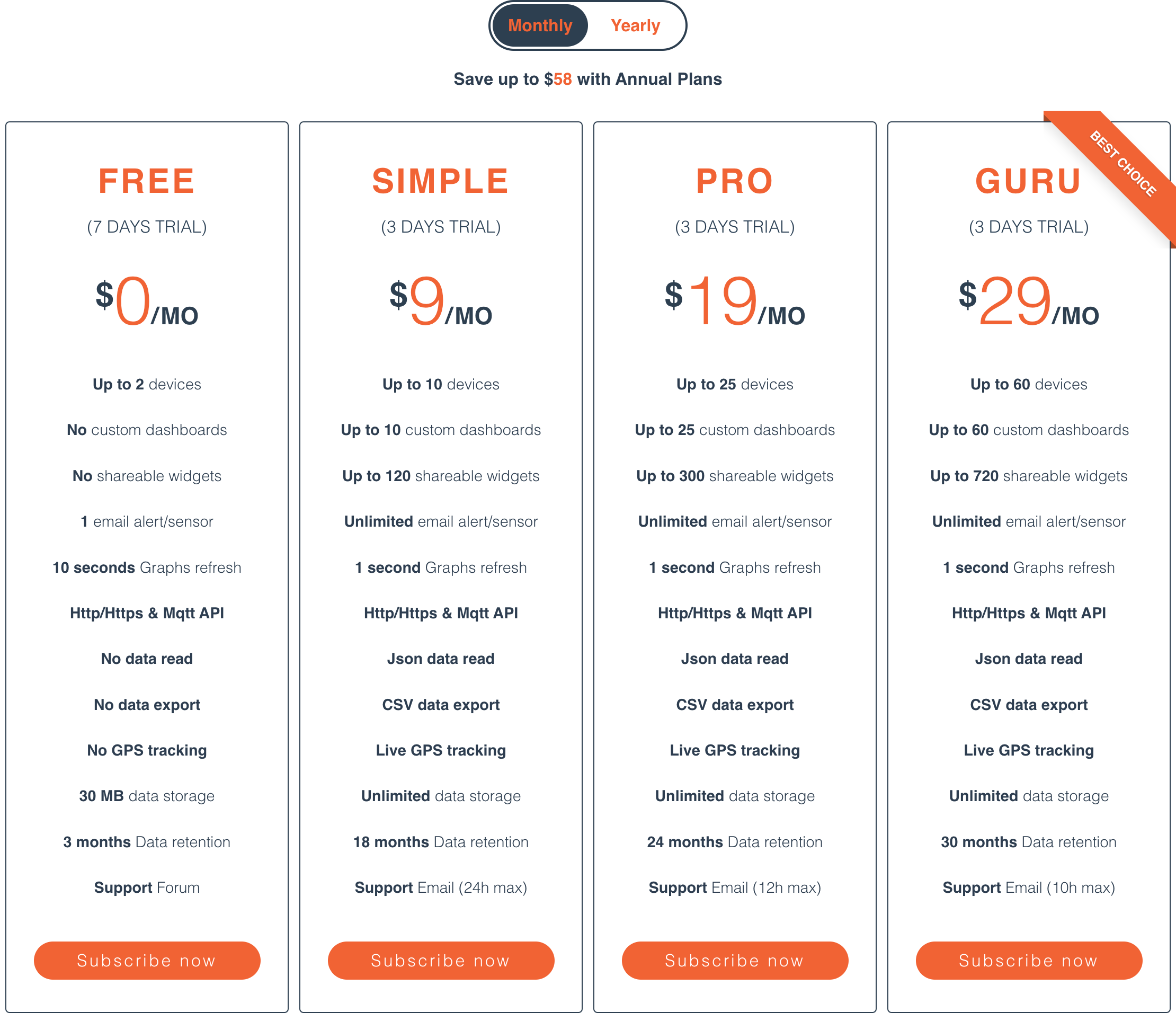 AskSensors comes with three main plans: Simple, Pro and Guru. Each plan could be selected for a monthly or yearly payment.